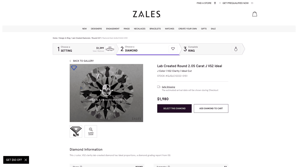 Our experience at nationwide jeweler Zales was similar. The least expensive J VS2 2ct diamond on their website was priced at $1,980