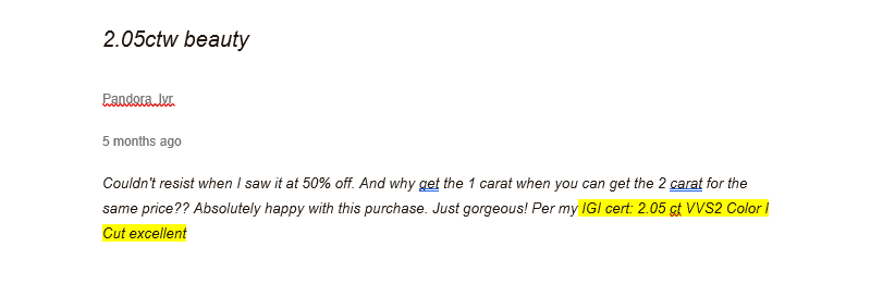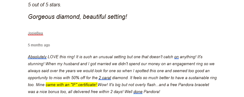 Pandora remains the only major jewelry company in the world to exclusively offer only lab grown diamonds and not carry a single mined diamond. But as a designer jewelry company, they sell complete engagement rings and do not offer the ability to pick your specific diamond for your ring style. In fact they advertise they will deliver within a broad range of F-J color and VS2 or better for their diamond rings. There can be a significant price difference between the top and the bottom of this range. But Pandora is such an ethically based company the consumer need not worry. We noted in their reviews several customers sharing that the diamond shipped to them was not at the bottom of the range specified. In fact the clarity seemed to be at the very top end of the range and the carat weight well above the minimum. For example, in this review, a Canadian customer indicates the clarity and weight well above the minimum: