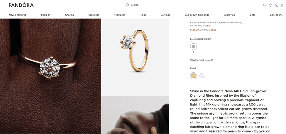 Though Pandora’s sales are still primarily in the charm bracelet category, with 43 years of satisfied customers many brand loyalists have been open to expanding their affinity to the brand to include necklaces and rings. Pandora quickly understood that the much lower price of lab grown diamonds would allow them to enter the diamond engagement ring category. After a brief test in the U.K. Pandora began selling lab grown diamond engagement rings worldwide in August of 2022.