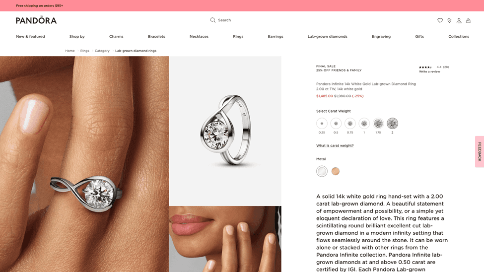 But even when we compare the minimum diamond quality of Pandora lab grown diamond engagement rings with major diamond centric brands, Pandora’s prices are extremely good if not the very best we found. For example the 2ct diamond engagement ring mentioned in the three reviews above was advertised for $1,485 on May 24, 2025.