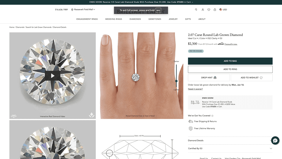 The least expensive J VS2 2ct lab grown diamond we found on Brilliant Earth cost $2,300 – and that was just for the diamond!