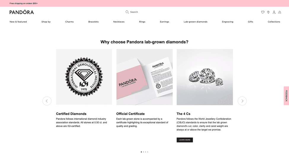 Pandora’s commitment to minimizing the environmental and ethical impact of diamond production sets them far above any other seller of diamonds we surveyed. For the diamond buyer to whom this is important, there may be no better choice than Pandora lab grown diamonds. More than any other producer, brand or retailer of diamonds, Pandora has been both an innovator and a leader in setting new standards.
