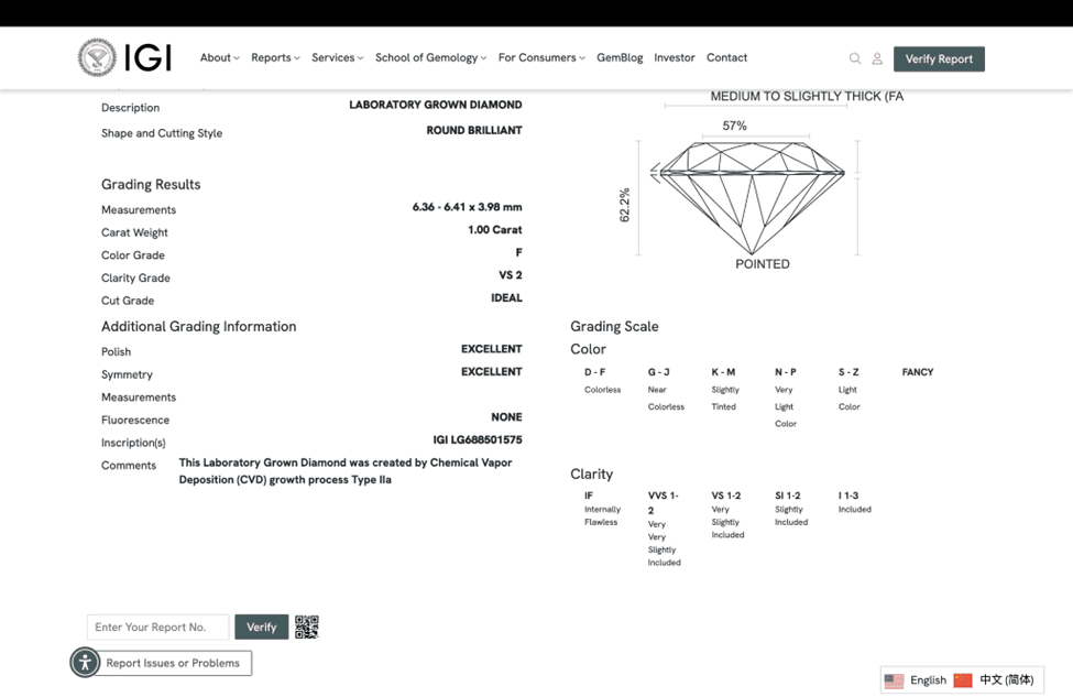We appreciate that Rare Carat does not clutter their site with smaller sizes of lab grown diamonds, which would only serve to confuse diamond shoppers. With a 1.06 carat, D VS2 lab grown diamond selling for $662 and a 3/4ct selling for $301, consumers should not consider anything less than a full 1 carat diamond when buying a lab grown diamond. Rare Carat’s marketplace serves customers well in that the vast majority of their lab grown diamonds are over 1 ct. Because of the much lower price of lab grown diamonds Rare Carat offers most certificates from the International Gemological Institute, IGI.
