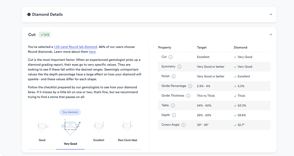 This is when the unique AI features developed by Rare Carat began to help us understand our selection. In the “Learn About Your Diamond” on the bottom of the page above, the first thing Rare Carat did was to tell us what was not exactly right with our diamond – which 3 of the 18 Rare Carat quality measures were deficient.