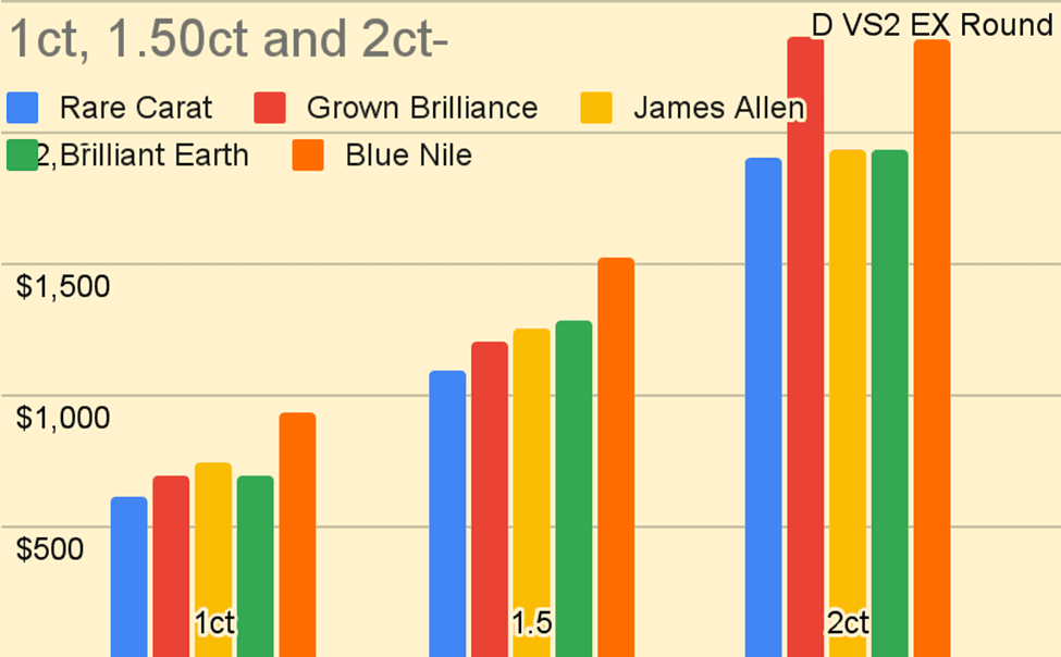 In one survey of several of the most significant online retailers of diamonds, we compared the prices of 1, 1½ and 2 ct D VS2 excellent cut lab grown diamonds certified by the IGI. The results make a compelling case for why consumers will often choose Rare Carat and why their marketplace model serves diamond shoppers like no other (note many direct links to diamonds at the time of this review often get removed after those individual diamonds are purchased):