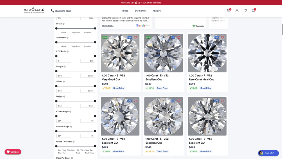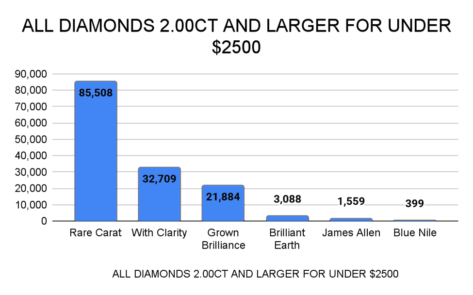 So our experts analyzed which of the online jewelers in our survey had the most diamonds and the most value in that range. Rare Carat serves diamond shoppers like no other source because they have so many more diamonds from which to choose: