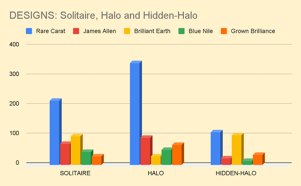 When our Editor and team first met Ajay he was laser-focused on establishing the greatest marketplace for natural diamonds. His website carried neither lab grown diamonds nor any finished jewelry. His expansion into helping his customers secure the best values on diamond engagement rings, wedding rings and diamond jewelry, though organic, was not something he drifted into without a lot of study and consideration for what a customer wants and needs. What Ajay discovered was that the majority of diamond engagement ring shoppers are very traditional. More than half will want some variation of a solitaire or a halo ring. Our Co-Founders can attest to the accuracy of Ajay’s understanding from their own work and experience. Their experience has confirmed that @20% of all sales for online jewelers will be only the diamond. The fact that the next 50% are focused narrowly in two design categories, solitaires and halos, proved fortuitous for Rare Carat. Just as they had in diamonds, they could focus and deliver the largest selection and most amazing values of the designs and styles most shoppers wanted. Our analysts compared the number of available styles in the three largest categories. They searched the terms solitaires, halos and hidden-halos on the websites of five leading online jewelers. The results were astounding: