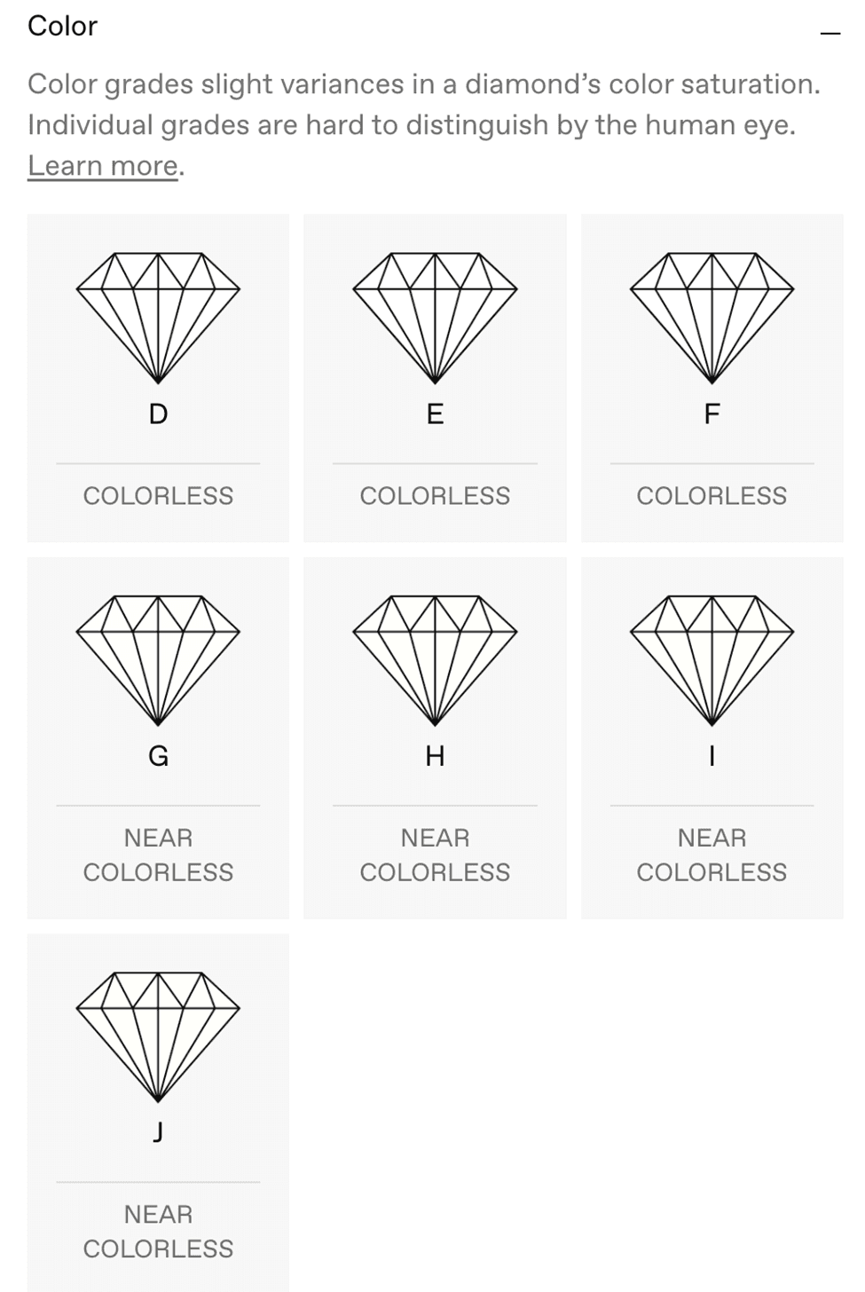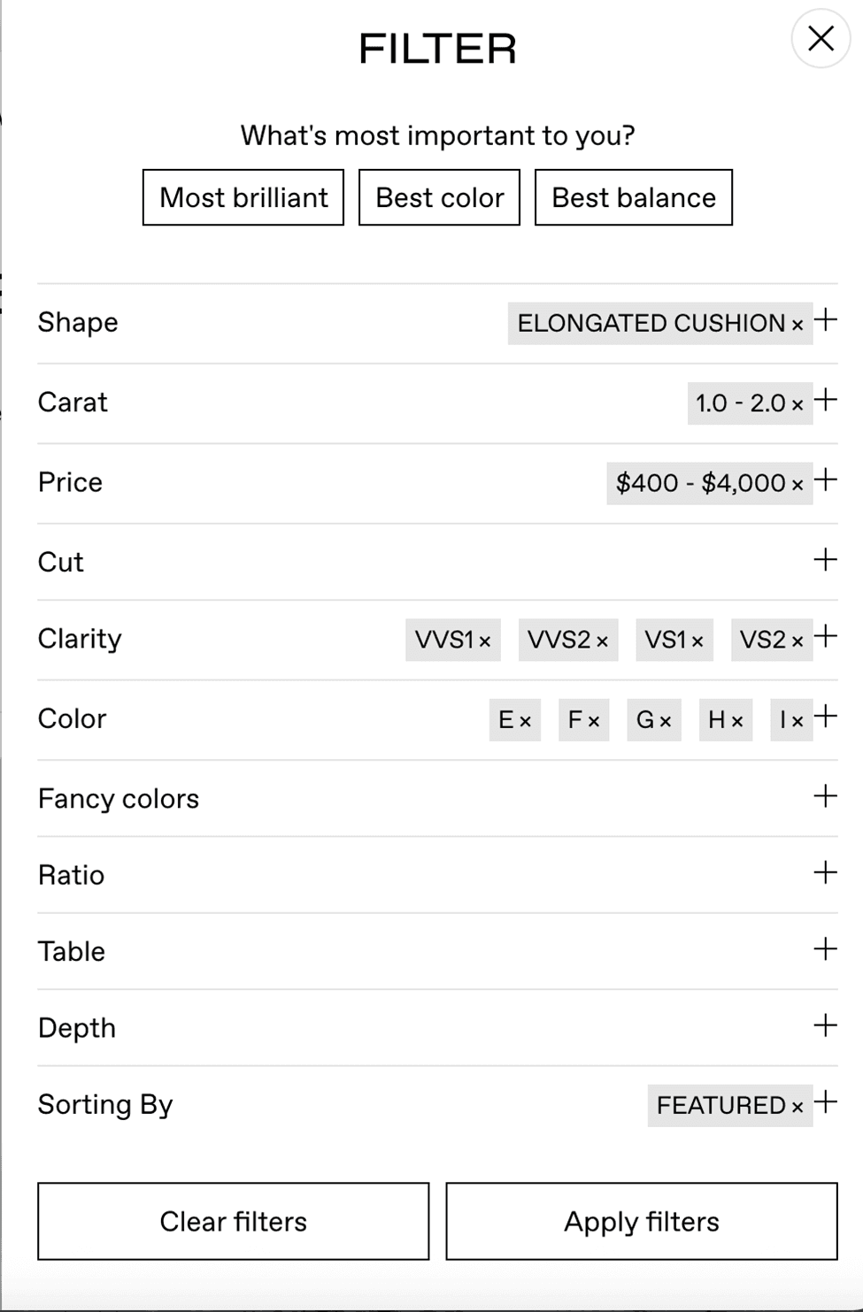 And drilling down into each filter is equally uncomplicated. For example, the diamond color filter icons make reading the words almost optional.