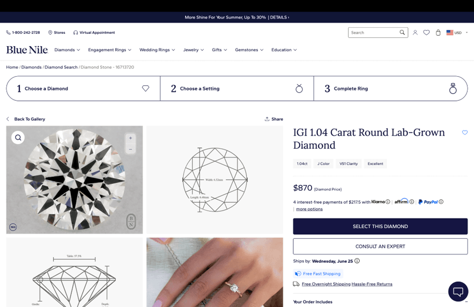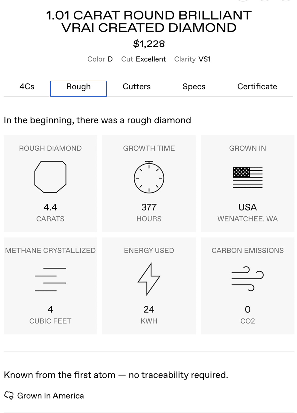 Our Editor and team were early pioneers in the validation and acceptance of lab grown diamonds. Over the last eight years, the technology for growing gem quality diamonds has improved, expanded and consolidated. The result has been that the price of lab grown diamonds have come down enormously. Because the cost of lab grown diamonds have corrected so much, our experts strongly advise consumers to only consider buying the topmost qualities, with 1 carat, F VS2, ideal cut as the minimum carat, color and clarity (more on this later). VRAI simplifies the shopping for a lab grown diamond by curating and limiting their assortment to what is best for consumers. Our survey on June 22, 2025 found only two round diamonds below 1ct for sale. We appreciate VRAI doing the work for consumers by limiting the lab grown diamonds available on their site to what is best for consumers.
