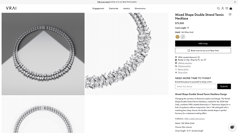 All of VRAI’s diamonds are carefully grown and polished for the best of all four C’s. The lowest color and clarity they will offer is J Si1, like most guild or luxury stores. Further testament to their positioning as the premier luxury lab grown diamond, diamond engagement ring and diamond jewelry brand is that 100% of the diamonds offered for sale are excellent cut or better. VRAI, however, is the only jeweler in our survey that does not offer an independent certificate of quality from the GIA or IGI. Like Tiffany, they offer their own internally graded certificate. For us, this is like grading your own homework. Tiffany has been around for almost 200 years and VRAI has been around for a little more than a decade. But they do have a diamond warranty if you submit your diamond to ” an internationally recognized diamond grading laboratory” and get a lower grade. According to an online chat our experts had with the team at VRAI: