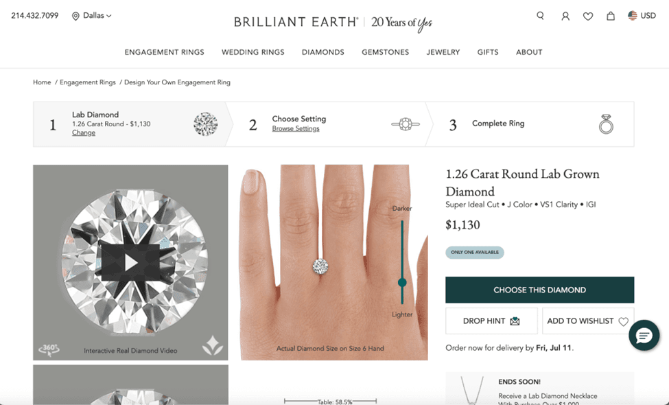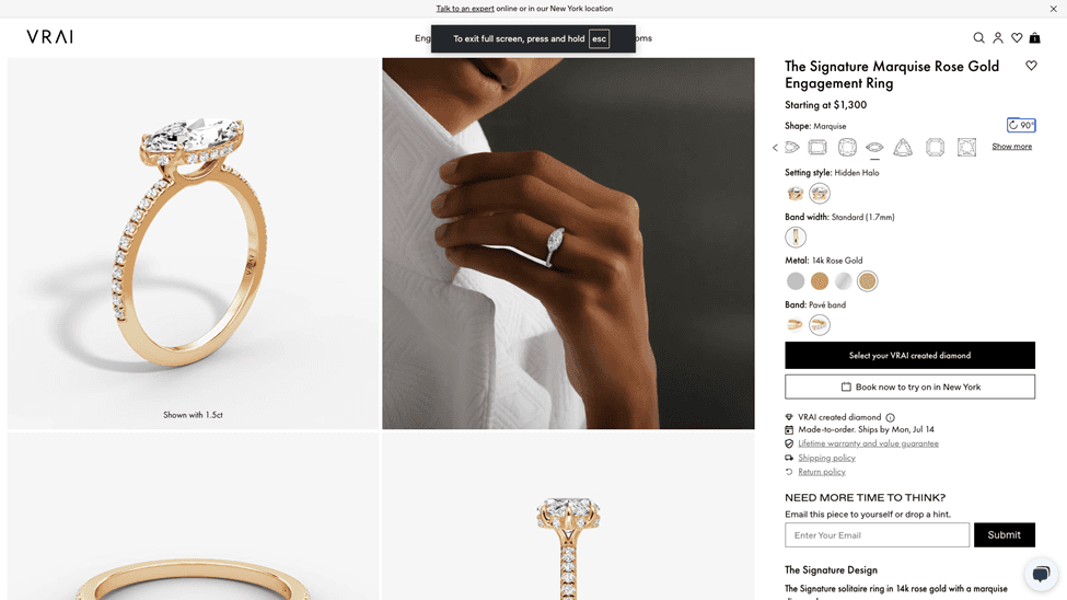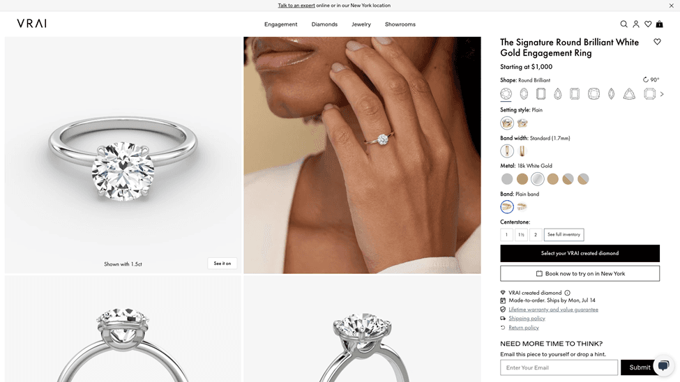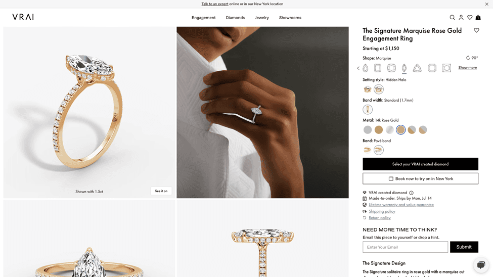 No other online jeweler we tested allowed this amount of personalization. Even those with far fewer options for personalization were more complicated or made us leave the page. VRAI’s customizable ring options were not only the most, they were the easiest to use and the most elegant.
