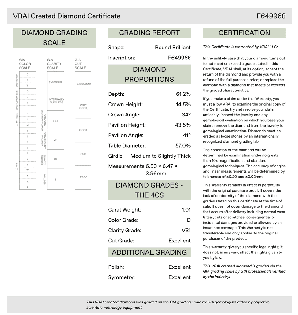 VRAI has end to end control of their supply chain in a way no other diamond jewelry or diamond engagement ring retailer can claim. This is because not only do they grow their own diamonds they also cut their own diamonds in their own polishing facility. Indeed the journey of a Vrai lab grown diamond is all internally managed and controlled. Other diamond retailers have tried to impose blockchain and traceability processes on their suppliers. Though we applaud these efforts, there still exists an inherent risk of error or deceit. For the consumer to whom sustainability, conflict free and quality are important VRAI is an unrivaled place to buy a diamond, diamond engagement ring or diamond jewelry. The level of transparency they deliver on each and every diamond they offer for sale is unsurpassed. For example, were a diamond buyer to select this gorgeous 1ct diamond