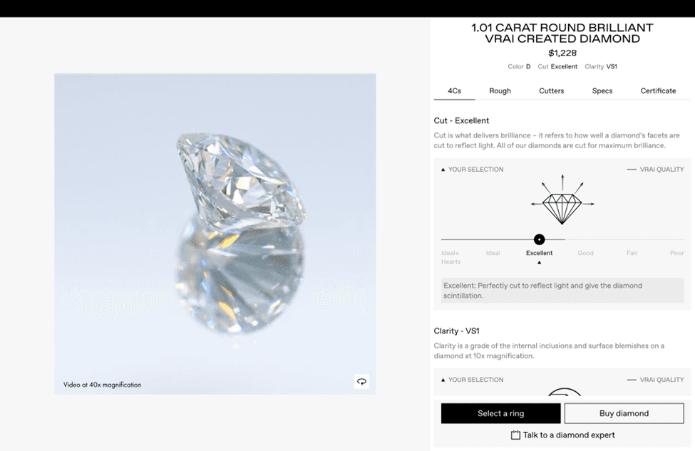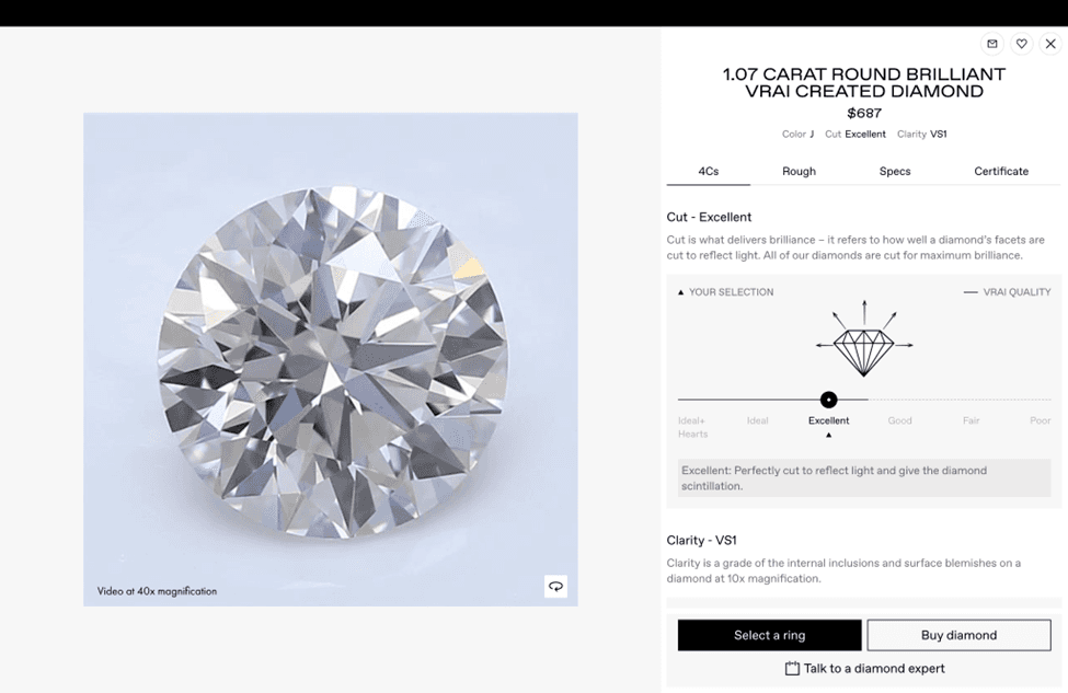 VRAI’s diamond videos magnify 40x, allowing a buyer to view top, bottom and sides. This is a significant leap beyond the10x top only magnification you might get in a traditional store. Through this technology a buyer is afforded a detailed inspection of all the diamond’s facets, top and bottom. As importantly, it also reduces the risk of misrepresentation, a common concern in online purchases. We like that VRAI displays so many actual diamonds when a diamond buyer searches their website because it gives the buyer control over how they prefer to shop. Both ways make it easy for a shopper to compare different diamonds.