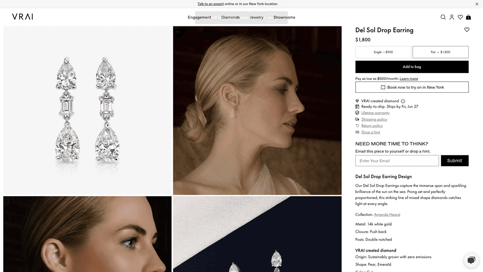 Of the major retailers of lab grown diamonds in America, the largest is part of a $7 billion conglomerate run by a man who formerly ran PetSmart. Another is owned by Warren Buffet’s Berkshire Hathaway and run by a man who spent all of his prior career in finance, mostly for Sprint telephones. Both jewelry companies were founded by men long retired or long gone. VRAI stands apart from all other lab grown retailers. VRAI is the only luxury jewelry brand that grows their own diamonds right here in the USA, was founded by a scientist who decoded how to grow diamonds and is run by a woman. VRAI is the only jeweler founded by and for a new generation with a mission to disrupt the mined diamond industry and serve up a guilt-free, sustainable lab grown diamond luxury alternative. Mission accomplished.