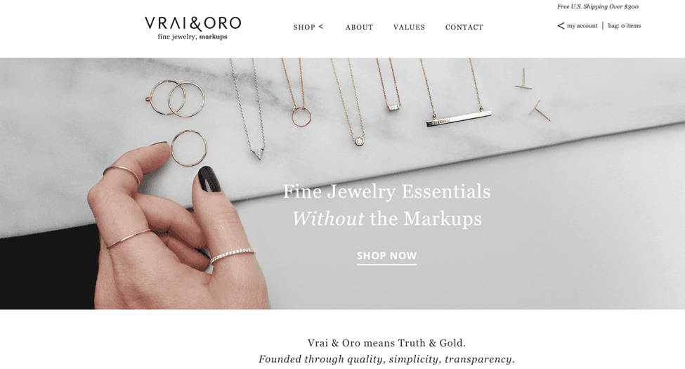 In buying VRAI, Martin demonstrated his understanding that a technology website named Diamond Foundry, a foundry being defined by the Oxford dictionary as “a workshop or factory for casting metal”, was never going to compete with Tiffany or Cartier. Moreover, it lacked the hip, fashion ethos of rising contemporary brands like Prada or Versace that offered cutting edge fashion and appealed to women. The nascent Vrai and Oro brand offered the shell into which Martin could insert the revolutionary technology he had created in Diamond Foundry. Think of it like the cool Delorean car in which the time machine was installed in Back to the Future. Here is a snapshot of the Vrai and Oro homepage from before the acquisition: